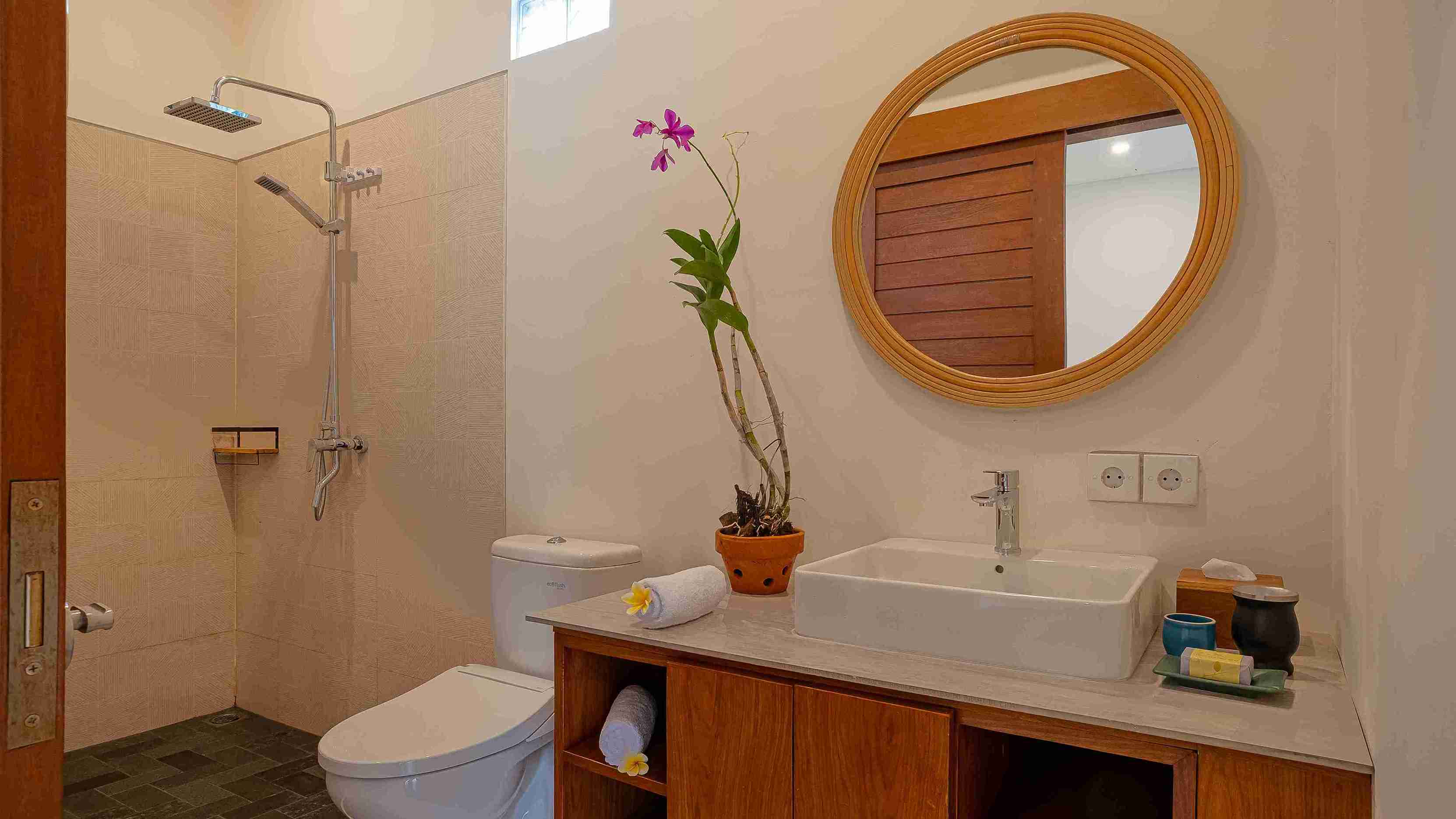 The villa features two spacious bedrooms with ensuite bathrooms, blending traditional Balinese design with modern touches for a cozy and relaxing stay.