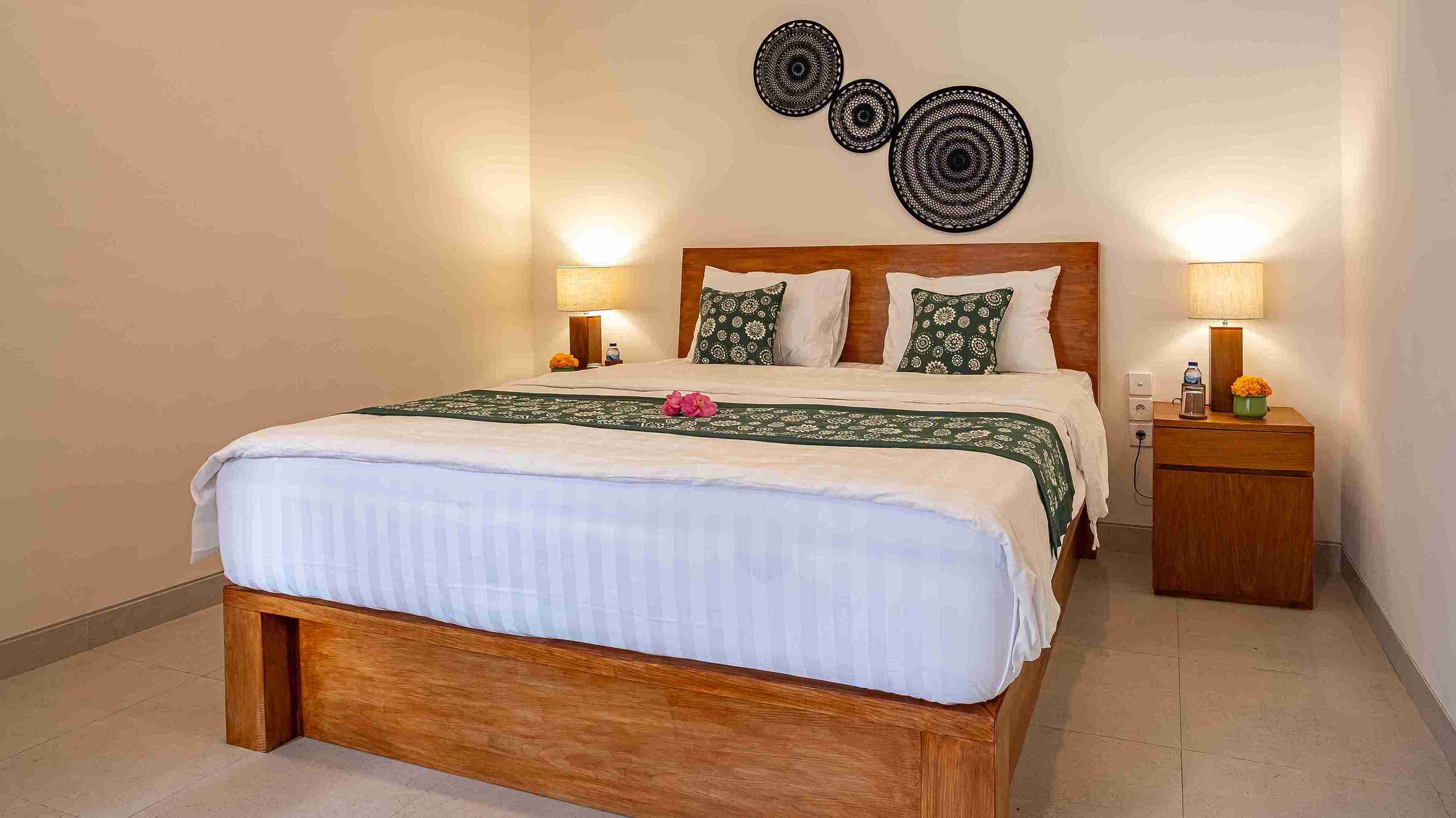 The villa features two spacious bedrooms with ensuite bathrooms, blending traditional Balinese design with modern touches for a cozy and relaxing stay.